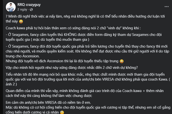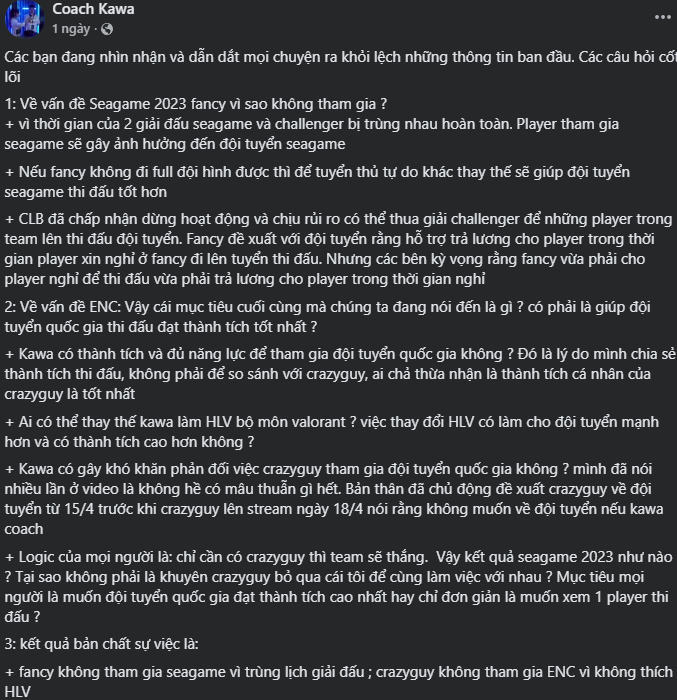 Mở đầu bài đăng của mình, Crazyguy không ngần ngại sử dụng những từ ngữ vô cùng gay gắt như tiểu nhân hay điều hướng dư luận để nói về vị HLV của Fancy United. Đáp trả lại những chỉ trích cho rằng bản thân từ chối cống hiến cho quốc gia, Crazyguy đã lật ngược thế cờ khi bóc trần những sự thật gây sốc về nội bộ FS. Theo lời anh, chính Fancy United đã ra lệnh cấm, không cho phép các tuyển thủ điền form đăng ký tham dự SEA Games cho Đội tuyển Quốc gia, bất chấp nguyện vọng cá nhân của các thành viên. Kịch tính hơn, nam tuyển thủ tiết lộ tổ chức này từng đưa ra yêu sách đòi Đội tuyển Quốc gia phải trả tiền lương cho tuyển thủ thay cho tổ chức thì mới chịu nhả người, đồng thời muốn can thiệp vào quyền kiểm soát đội tuyển.